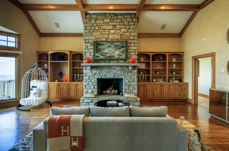 Walk in through the large wooden doors, and you will feel the warmth from the wood walls and ceilings. The great room offers impeccable designs and furnishings, along with an impressive stone fireplace that sits between built-in bookshelves and a 65" flatscreen. The furniture is high-end, mostly Mitchell Gold + Bob Williams. A lavish baby grand piano sits in front of the windows that show off the view.