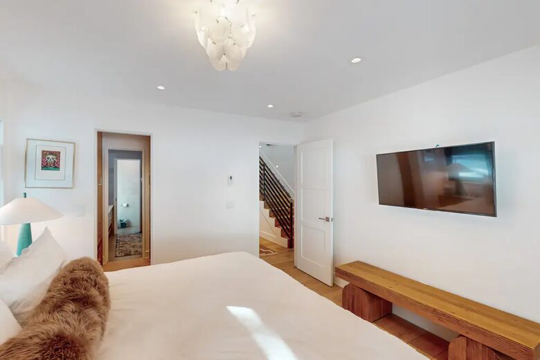 The primary bedroom is a haven of comfort, featuring soft linens, a large Smart TV, and awe-inspiring views that promise a serene start to each day. The luxury continues in the en suite bathroom, equipped with dual sinks and a walk-in steam shower—perfect for indulging after a day on the slopes or hiking trails. Bright and airy, every bedroom in this home ensures a peaceful night's rest for all.